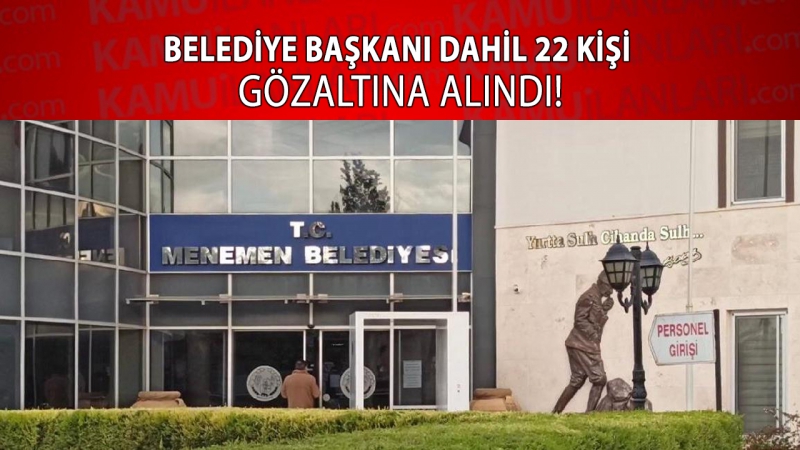 İzmir Cumhuriyet Başsavcılığı'nın başlattığı soruşturma kapsamında, Menemen Belediyesi'ne operasyon düzenlendi. Menemen Belediye Başkanı Serdar Aksoy, Başkan Yardımcısı Mehmet Cin, Mali İşler Daire Başkanı Mustafa İlhan, Satın Alma Müdürü Teoman Tuna, muhasebe Müdürü Nagehan Karaca, Fen İşleri Müdürü Gazi Koşum, Şantiye Şefi Kenan Yasatürk ile bazı hurda firmaları sahipleri ile bazı belediye personeli gözaltına alındı. Haklarında rüşvet, zimmet, görevi kötüye kullanma gibi çok sayıda suçlama bulunan şüphelilerin emniyetteki işlemlerinin sürdüğü öğrenildi.