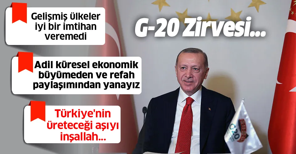 Cumhurbaşkanı Recep Tayyip Erdoğan, "Geliştirilen aşılar, mevcut adaletsizlikleri daha da derinleştirmek yerine insanlığın ortak malı olacak şekilde kullanıma sunulmalıdır. Bu çerçevede G20 platformu aşıya herkesin uygun maliyetli ve hakkaniyetli erişimini güvence altına alacak mekanizmaları hazırlamalı ve işletmelidir." dedi.