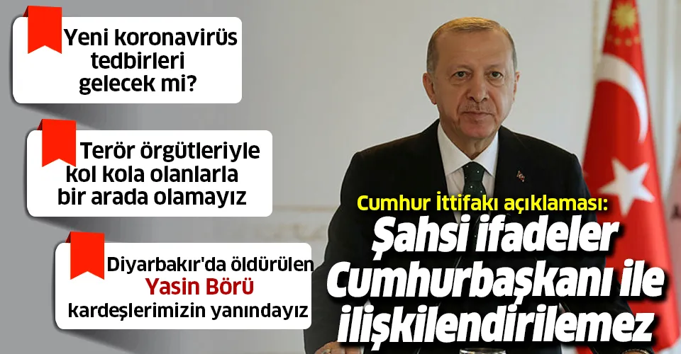 Cumhurbaşkanı Erdoğan, "Son günlerde bizimle asla ilgisi olmayan kimi bireysel açıklamalar ile reform gündemimize yaptığımız vurgular bahane edilerek yeni bir fitne ateşi yakılmaya çalışıldığını görüyoruz. Velev ki geçmişte birlikte çalışmış olsak bile hiç kimsenin şahsi ifadeleri Cumhurbaşkanı'yla hükümetimizle partimizle ilişkili hale getirilemez. Bizim ne dediğimiz, nerede durduğumuz, nereye gittiğimiz bellidir ve istikametimizde en küçük bir değişiklik yoktur." diye konuştu.