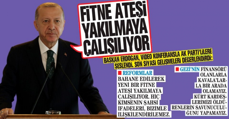 Başkan Erdoğan, video konferansla Ak Parti’lilere seslendi. Son siyasi gelişmeleri değerlendirdi: Reformlar bahane edilerek yeni bir fitne ateşi yakılmaya çalışılıyor. Hiç kimsenin şahsi ifadeleri, bizimle ilişkilendirilemez.