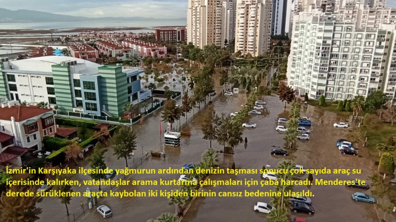 İzmir'in Karşıyaka ilçesinde yağmurun ardından denizin taşması sonucu çok sayıda araç su içerisinde kalırken, vatandaşlar arama kurtarma çalışmaları için çaba harcadı. Menderes'te derede sürüklenen araçta kaybolan iki kişiden birinin cansız bedenine ulaşıldı.