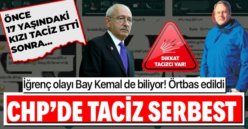 'da, SABAH Gazetesi'nin gündeme getirdiği   Başkanı 'ın, 17 yaşındaki partili S.G.'ye taciz skandalına, bir yenisi daha eklendi. 17 yaşındaki parti görevlisi genç kıza  üzerinden mesajlar atarak ilişki kurmaya çalışan CHP'li yönetici, genç kızın soruları karşısında "Bana abi deme. Senden hoşlanıyorum" diyerek konuya girmişti. Sonrasında ise genel merkezden destek arayan mağdur kız ve ailesi adeta şok yaşamıştı. Ortaya çıkan yeni skandalda ise tacizci başrol aynı, mağdur 28 yaşında bir genç kadın.