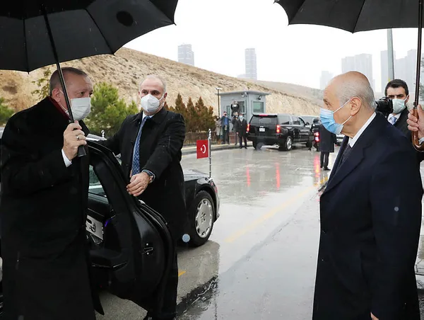 Başkan Recep Tayyip Erdoğan, MHP Genel Başkanı Bahçeli ile bir araya geldi. Erdoğan, Bahçeli'yle selamlaşmasının ardından yağışlı havayı işaret ederek, "Selamun Aleyküm, rahmetle geldik." dedi. Ziyaret, MHP Genel Başkanı Bahçeli’nin evinde gerçekleşti. Bahçeli, görüşme sonrası Başkan Erdoğan'ı aracına kadar uğurladı.