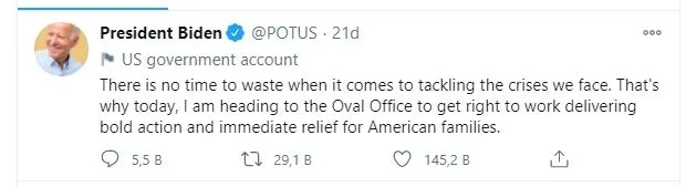 ABD Başkanlarına ayrılan "POTUS" kullanıcı adlı Twitter hesabından yaptığı paylaşımda Biden,"Karşı karşıya kaldığımız krizleri çözmek için boşa harcayacak zamanımız yok. Bu nedenle de bugün buradayım. Oval Ofis'e cesur adımlar atmak ve Amerikalı ailelerin ihtiyaç duyduğu yardımı sağlamak için gideceğim." ifadesine yer verdi.
