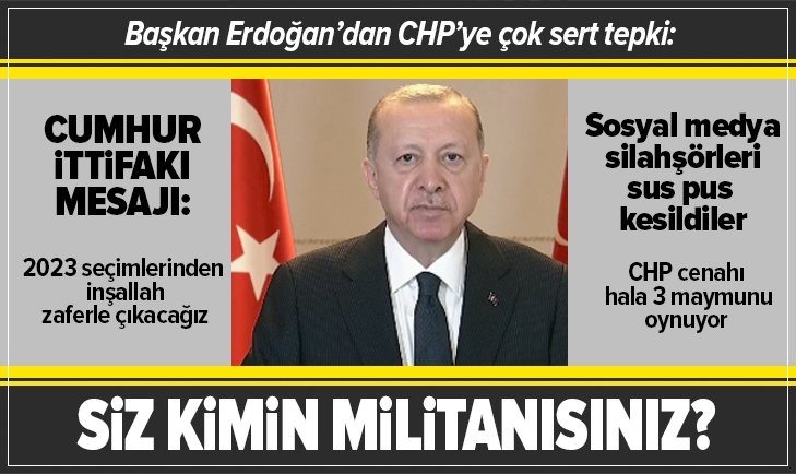 Son dakika haberine göre AK Parti Genişletilmiş İl Başkanları Toplantısında önemli açıklamalarda bulunan Başkan Recep Tayyip Erdoğan,"Son toplantımızda CHP'deki taciz, tecavüz furyasına dikkat çekerek CHP yönetiminin bu tablo karşısında yüzlerinin kızarmamasından duyduğum üzüntüyü söylemiştim. CHP cenahı hala 3 maymunu oynamayı sürdürüyor. CHP yönetimi bu meseleyi unutturmaya çalışıyor. Benzer meselelerde ortalığı birbirine katan sosyal medya silahşörleri mesele CHP olunca sus pus kesildiler. Gerçekler yüzlerine çarpıldığı hala pişkinlikle yalanlarına devam ediyorlar." diyerek sert çıktı. Başkan Erdoğan, ''Bu milletin hakimine, polisine, öğretmenine laf edenler siz kimin ve neyin militanısınız'' dedi. Erdoğan, "2023 seçimlerinden Cumhur İttifakı ile birlikte inşallah zaferle çıkacağız." ifadelerini kullandı..