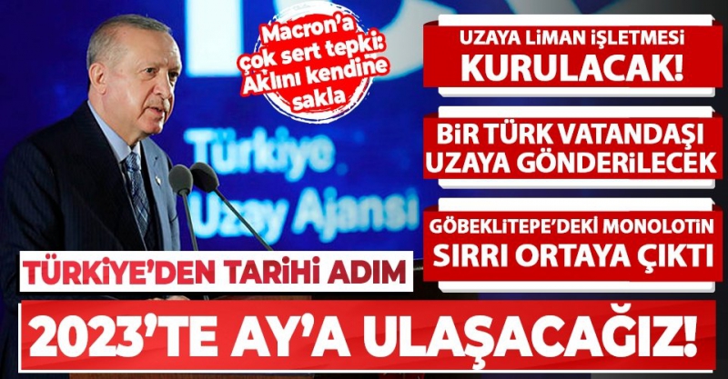 Başkan , Beştepe Millet Kongre ve Kültür Merkezi’nde  Ajansı tarafından hazırlanan ‘Milli Uzay Ajansı’ Tanıtım Toplantısı'nda konuştu. Başkan Erdoğan Türkiye'nin 2023'te Ay'a ulaşma hedefi olduğunu belirtirken bir Türk vatandaşını da Uzay'a göndermek istediklerini ifade etti. Ayrıca Batı ülkelerinin Türkiye'ye yönelik eleştirilerine cevap veren Başkan Erdoğan "Çılgın Türkler" ifadesini kullandı. Erdoğan ayrıca Macron'un sözlerine "Sen önce Ruanda'nın hesabını ver, Fransa'nın ellerinde kan var" yanıtını verdi.