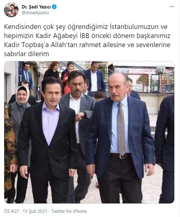 13 Şubat 2021'de İstanbul Büyükşehir Belediye eski Başkanı Kadir Topbaş, tedavi gördüğü hastanede hayata gözlerini yumdu.