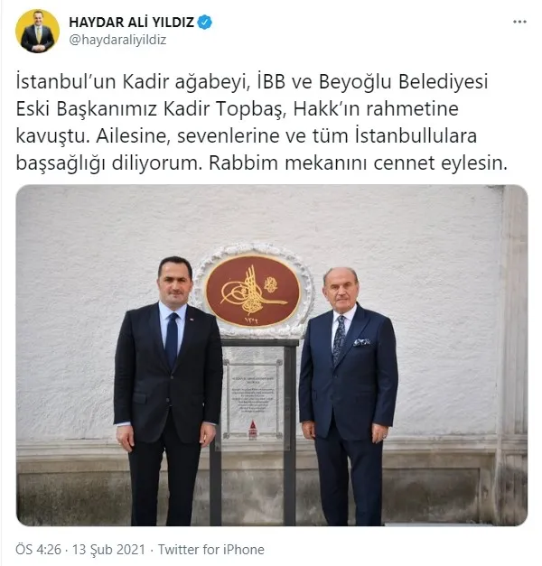 Beyoğlu Belediye Başkanı Haydar Ali Yıldız: İstanbul'un Kadir ağabeyi, İBB ve Beyoğlu Belediyesi Eski Başkanımız Kadir Topbaş, Hakk'ın rahmetine kavuştu. Ailesine, sevenlerine ve tüm İstanbullulara başsağlığı diliyorum. Rabbim mekanını cennet eylesin.