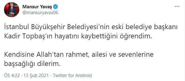 Ankara Büyükşehir Belediye Başkanı Mansur Yavaş: İstanbul Büyükşehir Belediyesi'nin eski belediye başkanı Kadir Topbaş'ın hayatını kaybettiğini öğrendim. Kendisine Allah'tan rahmet, ailesi ve sevenlerine başsağlığı dilerim.