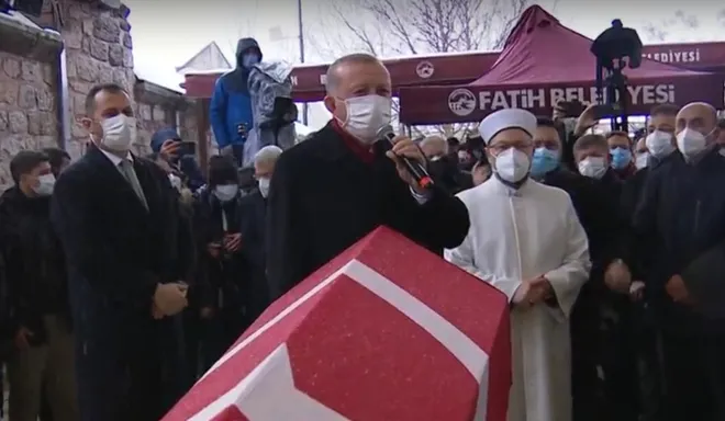 Başkan Erdoğan: Saygıdeğer kardeşlerim, muhteremen müminler her şeyden evvel şu an musallada bulunan değerli büyüğümüz Kadir Topbaş beyle yol arkadaşlığımız şuracıkta Çarşamba'da İstanbul İmam Hatip Okulu'nda başladı. Tabi buraya girdiğimizde Kadir abimiz benim 4-5 sınıf önümdeydi. O zamanlar aynı anda oranın kantinine bakarlardı. Orada başlayan yol arkadaşlığımız daha sonra davada da beraber sürdü.