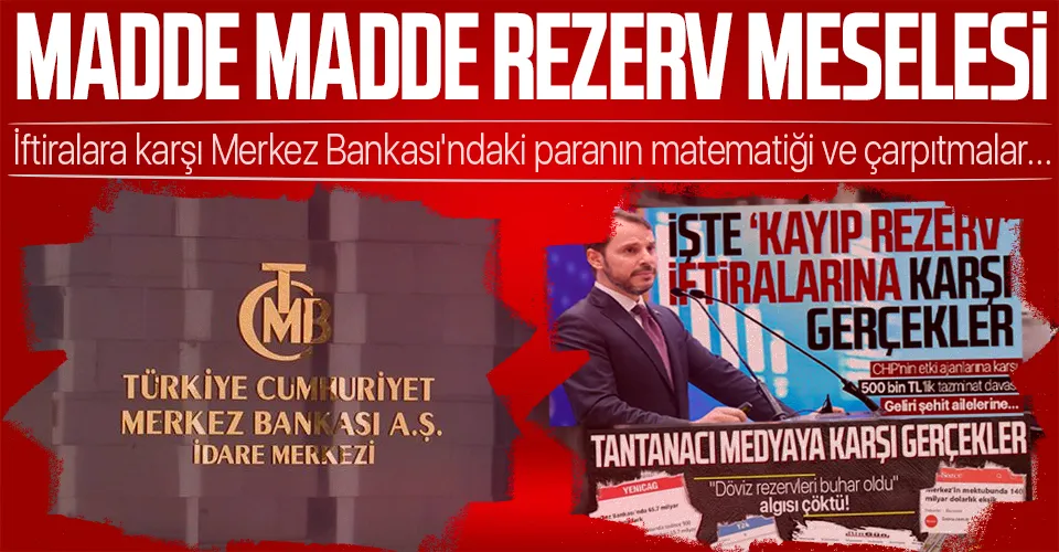 Eski Hazine ve Maliye Bakanı Berat Albayrak, çirkin iftira ve karalama kampanyalarına karşı harekete geçti. Berat Albayrak'ın vekili Avukat İsa Sinan Göktaş tarafından yapılan açıklamada "Merkez Bankası rezervlerine yönelik işlemler yürürlükteki mevzuata uygun bir şekilde finansal istikrar ve fiyat istikarı hedefleri doğrultusunda ödemeler dengesi ihtiyaçlarına uygun bir şekilde gerçekleştirilmiştir. Merkez Bankasının herhangi bir miktarda döviz ya da TL cinsinden kaynağının farklı yere transfer edilme, yok olma, buhar olma ihtimali yoktur. Ayrıca para akışının her bir kuruşunun izi sürülebilir ve takip edilebilirdir." denildi.