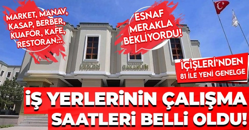 İçişleri Bakanlığı tarafından valiliklere “İşyerlerinin Çalışma Saatleri” konulu genelge gönderildi. Genelgeye göre, market, manav, kasap, berber, kuaför ve güzellik salonu, terzi, ayakkabıcı vb. işyerleri düşük, orta ve yüksek risk grubundaki illerde 07.00 - 20.00 saatleri arasında açık olacak. İşte son dakika gelişmesinin detayları...