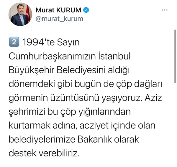 Bakan Kurum, Cumhurbaşkanı Recep Tayyip Erdoğan'ın 1994 yılında İstanbul'da belediye başkanı olduğu zamanları hatırlatarak, "Sayın Cumhurbaşkanımız Recep Tayyip Erdoğan, 1994 yılında İstanbul Büyükşehir Belediye Başkanlığını kazandığında çöp, çamur ve çukurla mücadele etti. Gelinen noktada İstanbul'u yeşil alanlarıyla, yürüyüş yollarıyla, parklarıyla, bahçeleriyle yaşanabilir bir şehir haline getirdik. Ancak bugün yine aynı sorunların İstanbul'da yaşanmaya başladığını görüyoruz ve çok da üzülüyoruz" dedi.