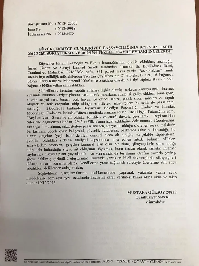 Bakırköy Cumhuriyet Başsavcılığı tarafından yürütülen soruşturma sonucu Ekrem İmamoğlu ve babası Hasan İmamoğlu hakkında 'dolandırıcılık' suçlaması ile iddianame düzenlendi. İddianamede Beykonakları sitesinden villa satın alan 3 kişi müşteki olarak yeraldı. Bir numaralı sanık Ekrem, iki numaralı sanık ise babası Hasan İmamoğlu oldu.