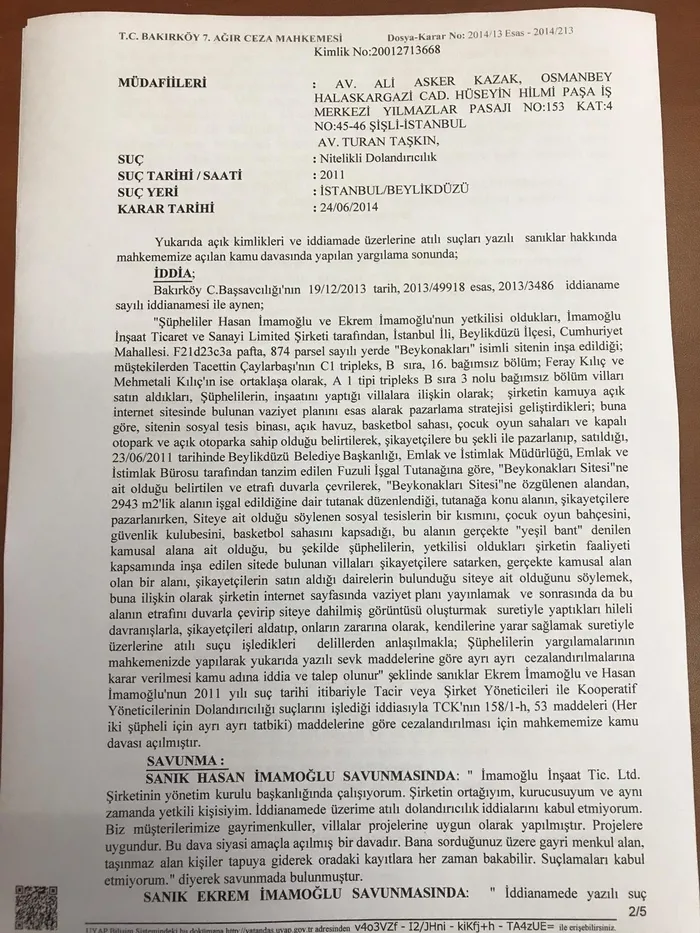 Bakırköy Cumhuriyet Başsavcılığı tarafından yürütülen soruşturma sonucu Ekrem İmamoğlu ve babası Hasan İmamoğlu hakkında 'dolandırıcılık' suçlaması ile iddianame düzenlendi. İddianamede Beykonakları sitesinden villa satın alan 3 kişi müşteki olarak yeraldı. Bir numaralı sanık Ekrem, iki numaralı sanık ise babası Hasan İmamoğlu oldu.