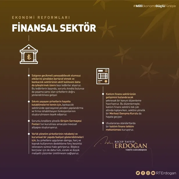 Finansal istikrarın sağlanması ve finans sektörünün geliştirilmesi de öncelikli konularımız arasındadır. Türk bankacılık sektörü finansal sağlamlık göstergelerinde pek çok ülkeye kıyasla güçlüdür. Sektörün bağışıklığını daha çok güçlendirmek istiyoruz. Salgının olumsuzluklarını bertaraf etmek için bazı tedbirler alıyoruz. Sorunlu kredisi bulunsa da yaşama şansı bulunan şirketlerin doğru yönlendirilmesi geliyor. Sıkıntı yaşayan şirketlerin ayakta kalması için bankacılık sektöründe operasyonel yeniden yapılandırma oluşumlarını teşvik ediyoruz.