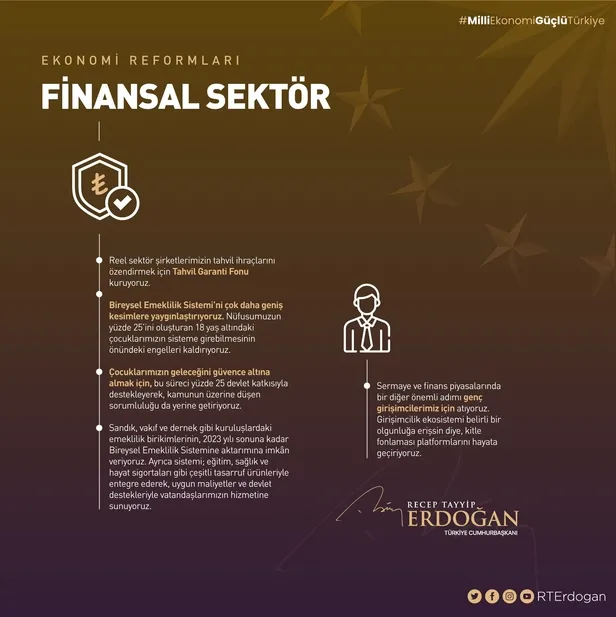 BES'in gelişmesi ve derinleşmesine katkı sağlıyoruz. BES'i çok daha genişletilmiş kesimlere yaygınlaştırıyoruz, 18 yaş altındaki çocuklarımızın sisteme girmesinin önündeki engelleri kaldırıyoruz. Bu süreci yüzde 25 devlet katkısıyla kamunun üzerine düşen sorumluluğu da yerine getiriyoruz. Böylece tasarruf alışkanlığı ve finansal okuryazarlık bilincinin gelişmesini teşvik ediyoruz. Sandık ve vakıf gibi kurumların emeklilik birikimlerinin 2023 yılı sonuna kadar BES'e aktarımına imkan veriyoruz.