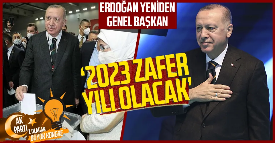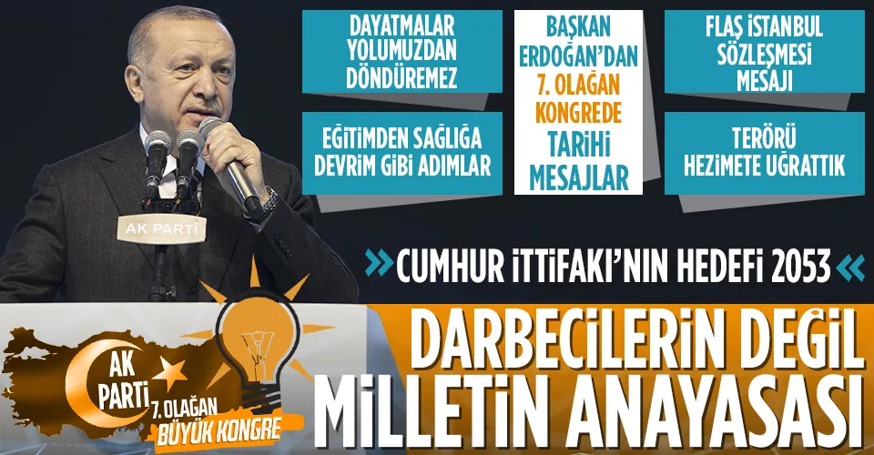Cumhurbaşkanı ve AK Parti Genel Başkanı Recep Tayyip Erdoğan, partisinin 7. Olağan Büyük kongresinde, "Uzunca bir süredir takip ettiğimiz rotamızın adı olan 2023 hedeflerimizi yeni bir başlangıç haline dönüştürerek, 21'inci yüzyılı ve ötesini kuşatacak büyük ve güçlü Türkiye'yi inşa ediyoruz" dedi.