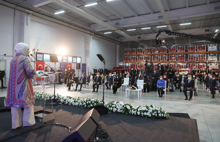 EMINE ERDOĞAN: Burada kadın çalışanların sayısının yüzde 78’i bulduğunu öğrendim. Gerçekten çok sevindirici bir rakam. Kadınlarımız, her zaman bu ülkenin taşıyıcı kolonlarıdır. Nitekim, düzen ve intizamıyla fabrikamıza kadın eli değdiği her halinden belli