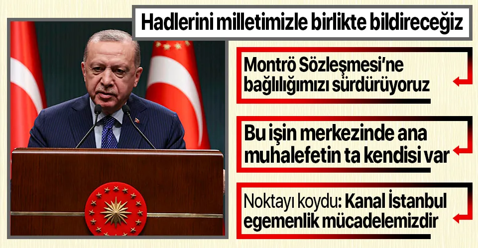 Cumhurbaşkanı Erdoğan, Kanal İstanbul ile Montrö Sözleşmesi arasında kurulan bağın da temelden yanlış olduğunun altını çizerek, "Türkiye Kanal İstanbul sayesinde İstanbul Boğazı'ndaki ağır deniz trafiği yükünü hafifletirken, Montrö'deki sınırlamaların dışında tamamen kendi egemenliğinde bir alternatife de kavuşmuş olacaktır. Bu bizim egemenlik mücadelemizdir" diye konuştu.