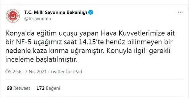 ''Konya'da eğitim uçuşu sırasında kaza kırıma uğrayan Hava Kuvvetlerimize ait NF-5 uçağımızın pilotu şehit olmuştur. Kahraman Pilotumuza Allah'tan rahmet, kederli ailesine, Türk Silahlı Kuvvetlerimize ve Yüce Türk Milletine başsağlığı ve sabır dileriz.''