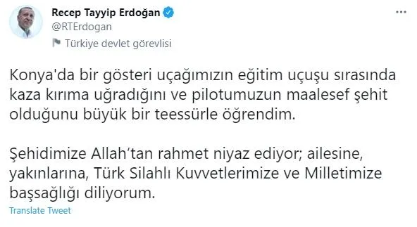 Başkan Recep Tayyip Erdoğan, sosyal medya adresinden Konya'da şehit olan pilot için başsağlığı mesajı yayınladı