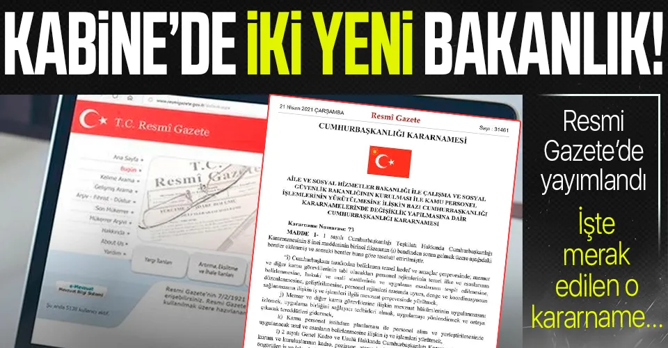 Kabinede son dakika değişikliği: Uzun süredir konuşulan ve hakkında spekülasyonlar da yapılan kabine değişikliği gerçekleşti. Kabine revizyonu sansasyonel bir değişim şeklinde kan tazeleme ve hizmet odaklı gerçekleştirildiği dikkat çekti. Bu kapsamda 2 yeni bakanlık kurulurken Ticaret Bakanlığı'nda da bayrak değişimi yaşandı. Başkan Recep Tayyip Erdoğan'ın bazı bakanlıklara yaptığı atamalara ilişkin kararlar Resmî Gazete'nin mükerrer sayısında yayımlandı. Buna göre Cumhurbaşkanlığı Kabinesinde Aile, Çalışma ve Sosyal Hizmetler Bakanlığı yerine Aile ve Sosyal Hizmetler Bakanlığı ile Çalışma ve Sosyal Güvenlik Bakanlığı kuruldu. İşte son dakika kabine revizyonu, yeni bakanlar ve kabine değişikliği ile birlikte oluşturulan yeni bakanlıklar