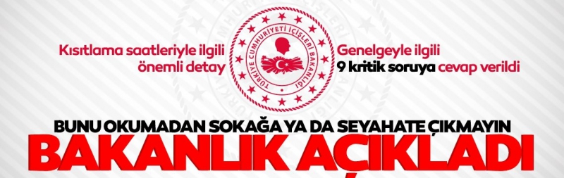 Bakanlık genelgesinde madde madde sıralanan düzenlemelerin içerisinde seyahat kısıtlamaları ve sokağa çıkma yasağı maddeleri önemli sorulara açıklık getirdi. Bu kapsamda bu sabah gelen son dakika açıklamasıyla İçişleri Bakanlığı tarafından genelgeye ilişkin 9 kritik soru cevaplandırıldı. İşte o sorular ve genelgedeki diğer ayrıntılar: