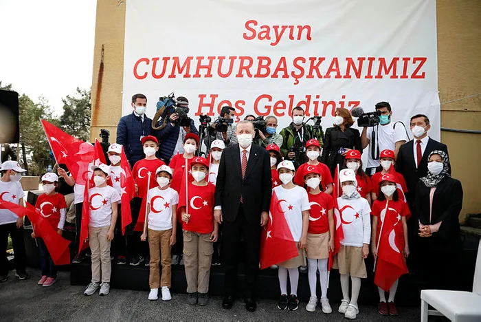 Başkan Erdoğan bayrağı göndere çocuklarla birlikte çekti. Cumhurbaşkanı Erdoğan, "Dalgalandığın yerde hüzün keder olmayacak" dedi. Bayrak göndere çekildikten sonra İstiklal Marşı okundu. İstiklal Marşı sonrası çocuklarla konuşan Başkan Erdoğan göndere çekilen bayrağı sorduğunda çocuklar hep bir ağızdan 'Çok güzel' dedi.