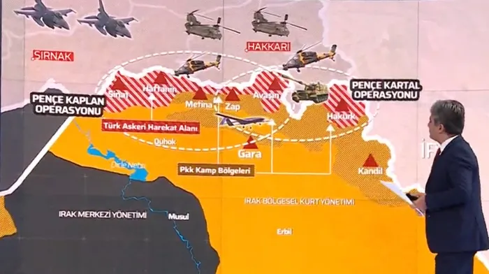 Son dakika haberi: Kuzey Irak'taki Metina, Zap, Avaşin, Basyan ve Kandil bölgelerine geniş çaplı operasyon başlatıldı.Türk Silahlı Kuvvetleri (TSK), 2.5 ay aradan sonra Kuzey Irak’ta terör örgütü PKK’ya karşı havadan ve karadan yeni bir harekat başlattı. Kuzey Irak'taki Metina, Zap, Avaşin-Basyan ve Kandil'deki PKK hedeflerinin ateş altına alındığı bildirildi. Cumhurbaşkanı Erdoğan, Irak'ın kuzeyinde terör örgütüne yönelik düzenlenen "Pençe-Şimşek ve Pençe-Yıldırım Operasyonu" Komuta Merkezi'ne bağlandı.