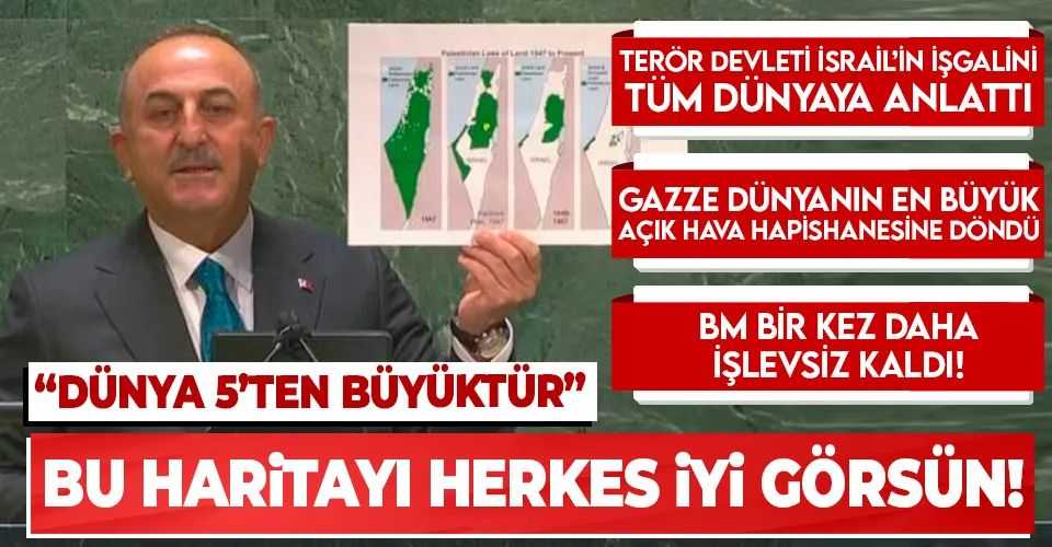 ''Bakın şu haritalar gerçekleri ortaya koyuyor, 1947 yılından bugüne kadar Filistin topraklarının nasıl gasbedildiğini, nasıl işgal edildiğini gösteren bir haritadır. Elbette bugün burada bulunan tüm temsilciler, bu haritayı her gün görebiliyorlar çünkü bu BM çatısı altında, Filistinli kardeşlerimiz sürekli bu haritaları sergiliyor. Ama bu haritayı dünya iyi görsün ve 1947'den bugüne İsrail'in Filistin topraklarını nasıl çaldığını, nasıl gasbettiğini iyi görsün ve hatırlasın. İşte 1947'den beri süren işgalin ve çekilen acıların özetidir biraz önce gösterdiğim harita.''