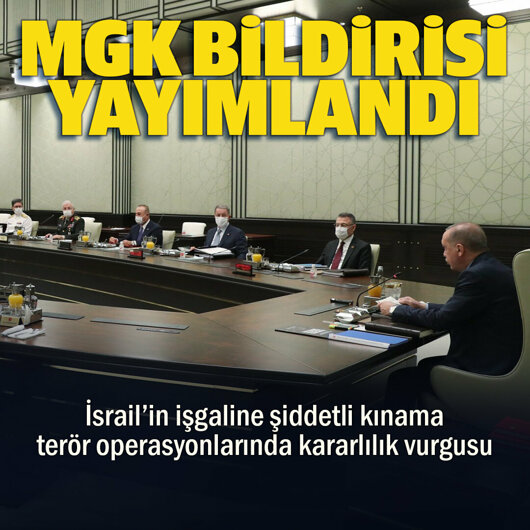 Son dakika haberi... Milli Güvenlik Kurulu (MGK) Bildirisi'nde, İsrail'in Filistin topraklarını hukuksuz işgali ve sivil halkı kasten hedef alan insanlık dışı eylemlerinin şiddetle kınandığı vurgulandı.
