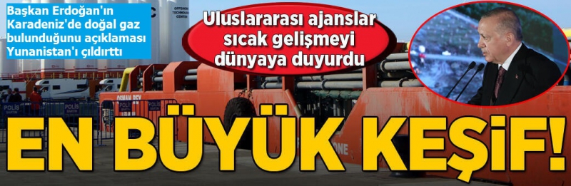 Son dakika haberine göre, Cumhurbaşkanı Recep Tayyip Erdoğan'ın Karadeniz'de doğal gaz bulunduğunu açıklaması Yunanistan'ı ayağa kaldırdı. Reuters ise açıklamayı acil koduyla duyurdu, dış basında müjde bir numaralı gündem maddesi oldu.