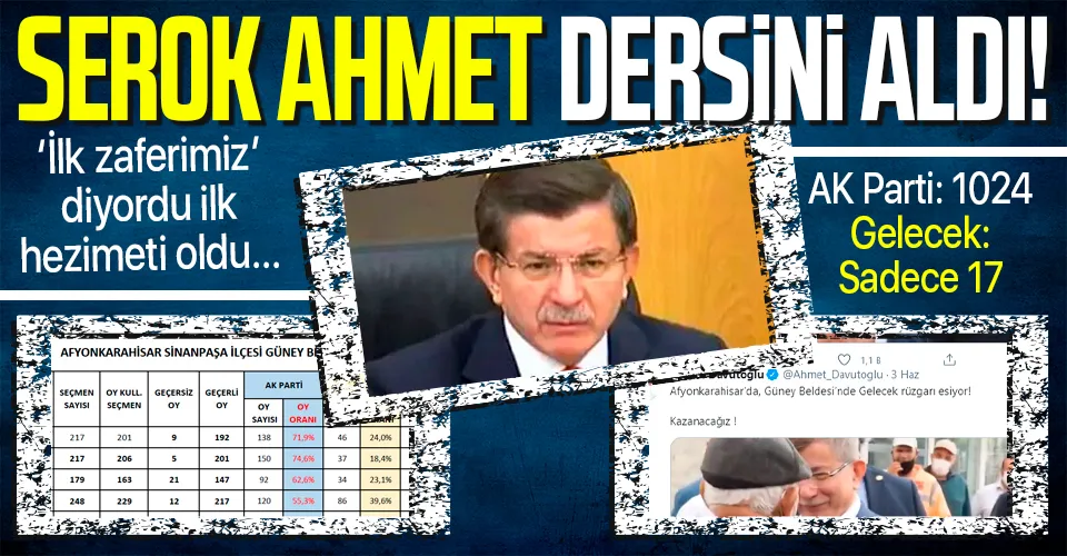 Kurduğu Gelecek Partisi ile ilk defa seçime giren Ahmet Davutoğlu, "İlk zaferimizi alacağız" dediği Afyonkarahisar'ın Güney beldesindeki seçimde yüzde 1 oy bile alamadı. Daha önceki açıklamalarında "Bir selam versem Anadolu'yu ayağa kaldırırım" diyen Davutoğlu dalga konusu oldu.