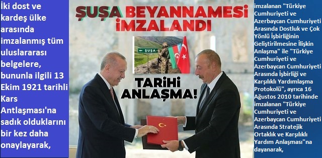 Cumhurbaşkanı Erdoğan ile Azerbaycan Cumhurbaşkanı Aliyev, iki ülke arasında "Şuşa Beyannamesi"ni imzaladı. Azerbaycan Cumhurbaşkanı Aliyev, Türkiye ile Azerbaycan arasında imzalanan "Müttefiklik Sözleşmesi"nde 100 yıl önce imzalanan Kars Anlaşması'na atıfta bulunulduğunu bildirdi.