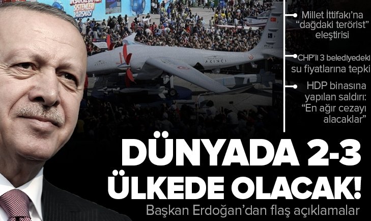 Erdoğan, Türkiye'nin artık kendi silahlı insansız hava araçlarını ürettiğine dikkati çekerek, "Şimdi bunun bir üst segmentine çıkıyoruz. Adı da Akıncı. Dünyada 2, bilemediniz 3 ülkede olacak. Bütün bunlar artık bir şeyi getiriyor. Türkiye savunma sanayisinde aracını, gerecini yaptığı gibi bunlarla ilgili bütün mühimmatını da hamdolsun yapar hale geldi." diye konuştu.
