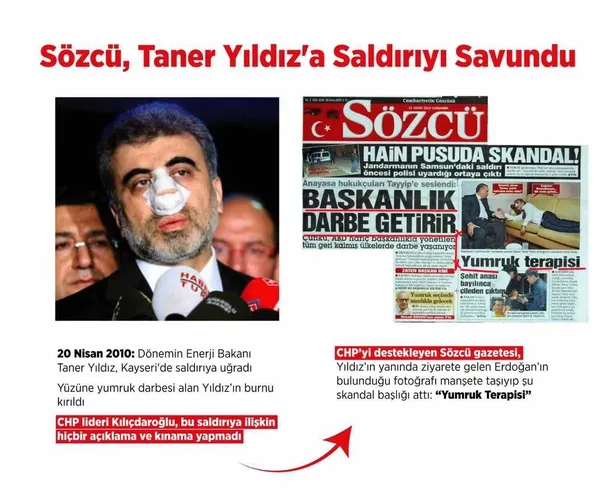 20 Nisan 2010'da dönemin Enerji Bakanı Taner Yıldız, Kayseri'de saldırıya uğradı. Yüzüne yumruk darbesi alan Yıldız'ın burnu kırıldı. CHP lideri Kılıçdaroğlu, saldırıya ilişkin hiçbir açıklama ve kınama yapmadı. Sözcu gazetesi ise Erdoğan'ın bulunduğu fotoğrafı manşete taşıyıp, "Yumruk terapisi" başlığını attı.
