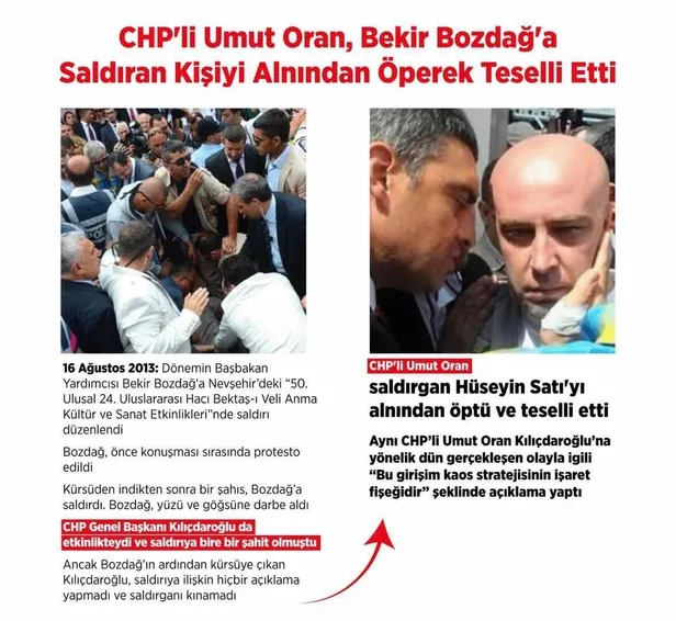 16 Ağustos 2013 yılında dönemin Başbakan Yardımcısı Bekir Bozdağ'a Nevşehir'de bir saldırı düzenlenmişti. Ve Kemal Kılıçdaroğlu saldırının düzenlendiği etkinlikteydi. Saldırıya bire bir şahit olan Kılıçdaroğlu, hiçbir açıklama yapmadı ve saldırıyı kınamadı. Öte yandan CHP'li Umut Oran, saldırgan Hüseyin Satı'yı alnından öpüp teselli etti. CHP'li Umut Oran Kılıçdaroğlu'na yönelik saldırıya ilişkin ise, "bu girişim kaos stratejisinin işaret fişeğidir" şekline açıklama escort-bayan-ilanlari">konak escort bayan.