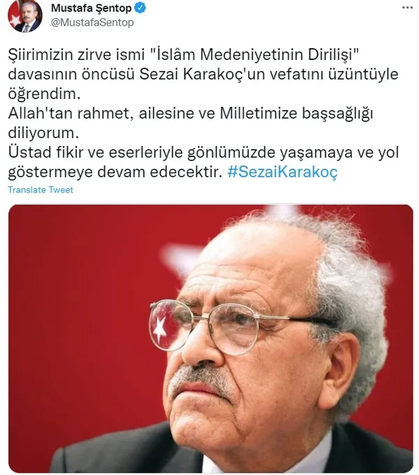 Altun paylaştığını mesajında; Doğunun yedinci oğlu, büyük mütefekkir ve şair Sezai Karakoç ağabeyimiz "en sevgili"ye kavuşmuş. Ruhu şad, mekanı cennet olsun." ifadelerini kullandı.
