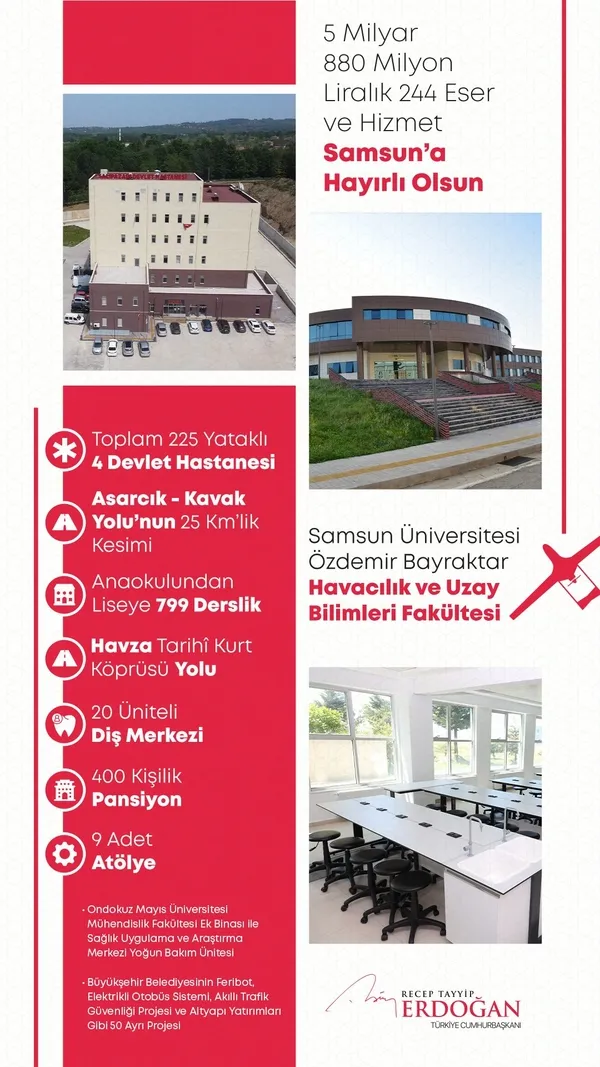 Samsun Üniversitesinin Özdemir Bayraktar Havacılık ve Uzay Bilimleri Fakültesi başta olmak üzere 60 milyon liralık yatırımla hayata geçirdiği Ballıca Kampüsü'ndeki 6 ayrı projesi ile Vezirköprü 150 yataklı devlet hastanesi ve 20 üniteli diş merkezinin, 25'er yataklı Salıpazarı, 19 Mayıs, Kavak devlet hastanelerinin, çeşitli ilçelerdeki sağlık merkezlerini de bugün açacaklarını aktaran Erdoğan, "Durmak yok. Bugün bir başka önemli adım, Asarcık-Kavak yolunun tamamlanan 25 kilometrelik kesimini ve Havza tarihi Kurtköprüsü yolunu hizmete sunuyoruz. Nasıl? Laf değil icraat, icraat." diye konuştu.