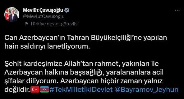 Kardeş Azerbaycan Dışişleri Bakanlığı, Tahran'daki büyükelçiliklerine silahlı saldırı düzenlendiği duyuruldu. Saldırıda Koruma müdürü hayatını kaybetti, 2 güvenlik görevlisi yaralandı. Türkiye'den alçak saldırıya ilişkin açıklama geldi. Dışişleri Bakanı Mevlüt Çavuşoğlu yaptığı açıklamasında, 'Hain saldırıyı kınıyoruz, Azerbaycan'ın yanındayız' ifadelerini kullandı.İran'a çağrıda bulundu.