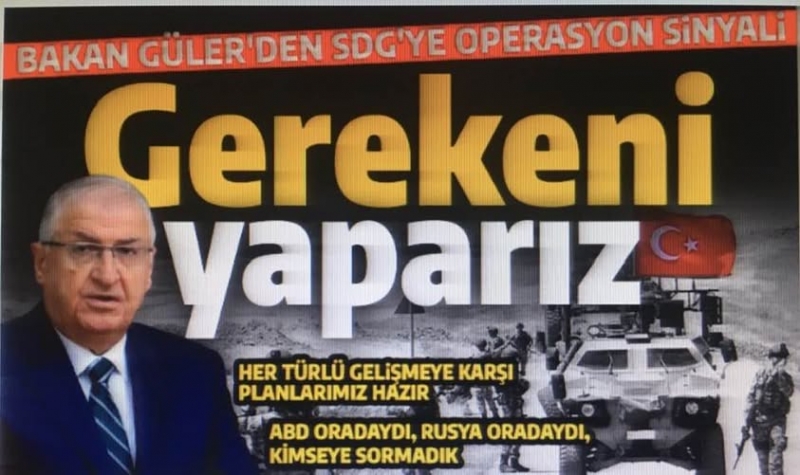 Milli Savunma Bakanı Güler, terör örgütü PKK/YPG’nin paravan ismi SDG'nin Suriye ordusuna entegrasyonu konusunda, "Birlik olarak değil, ferdi olarak entegre olmaları lazım. Aksi halde bunun adı entegrasyon olmaz. Suriye ordusuna entegre olmayan SDG’ye karşı operasyon için kimseden icazet almayız." açıklamasında bulundu.