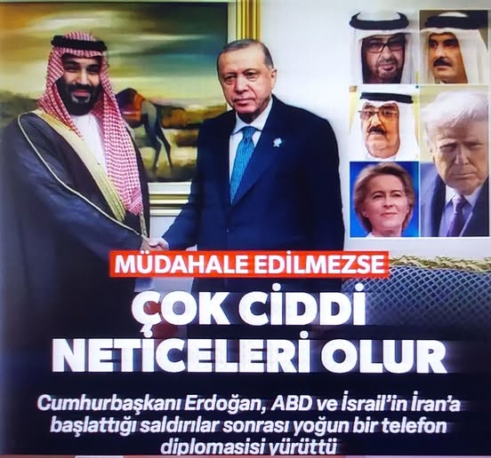 Cumhurbaşkanı Erdoğan, ABD ve İsrail’in İran’a başlattığı saldırılar sonrası yoğun bir telefon diplomasisi yürüttü. S. Arabistan Veliaht Prensi Muhammed b. Selman, Kuveyt Emiri Şeyh Sabah ve AB Komisyonu Başkanı Ursula von der Leyen ile görüşen Erdoğan, müdahalede bulunulmaması halinde çatışmaların bölgesel ve küresel güvenlik açısından çok ciddi neticeleri olacağı endişesi taşıdığını belirtti.