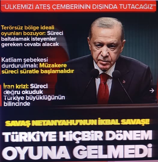 Cumhurbaşkanı Recep Tayyip Erdoğan'ın başkanlığında Beştepe'de biraraya gelen Kabine Toplantısı sona erdi. Cumhurbaşkanı Erdoğan kritik toplantı sonrası açıklamalarda bulundu. Cumhurbaşkanı Erdoğan, "Tarihimizin hiçbir döneminde oyuna gelmedik. Bugün de birilerinin bizi çekmek istediği tuzaklara düşmüyoruz. Tedbirli, temkinli ve soğukkanlı bir şekilde, sükuneti elden bırakmadan, kardeşlik ve komşuluk hukukuna riayet ederek bu süreci yönetiyoruz. Ülkemizi, bu ateş çemberinin dışında tutmakta kararlıyız" dedi. Öte yandan Cumhurbaşkanı Erdoğan, "Savaş, İsrail'in savaşı olmakla birlikte bedelini tüm dünya ödüyor. Savaş, Netanyahu'nun ikbal savaşı ama ceremesini 8 milyar çekiyor. Netanyahu'nun başında olduğu katliam şebekesi, bölge barışı adına, insanlık adına artık derhal durdurulmalı, her ülke bu konuda cesur ve ön alıcı bir tutum sergilemelidir." ifadelerini kullandı.