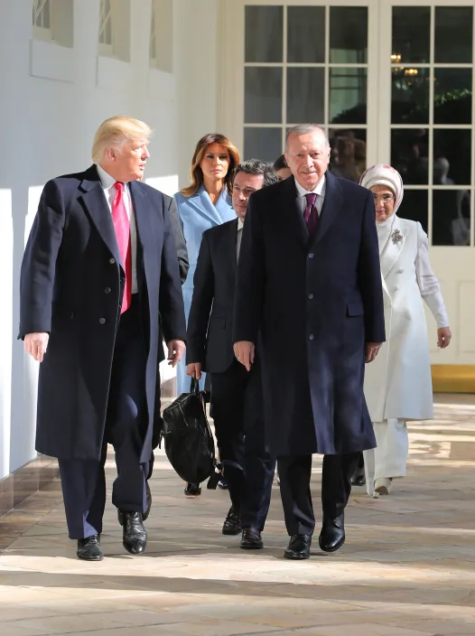 Cumhurbaşkanı Recep Tayyip Erdoğan, ABD Başkanı Donald Trump ile Beyaz Saray'da bir araya geldi. Cumhurbaşkanı Erdoğan ve eşi Emine Erdoğan, Beyaz Saray'da ABD Başkanı Donald Trump ve eşi Melaine Trump tarafından karşılandı. Erdoğan ve Trump daha sonra ikili görüşmeye geçti. Erdoğan ve Trump'ın ikili görüşmesi 1 saat 15 dakika sürerken iki lider çalışma yemeğine geçti.