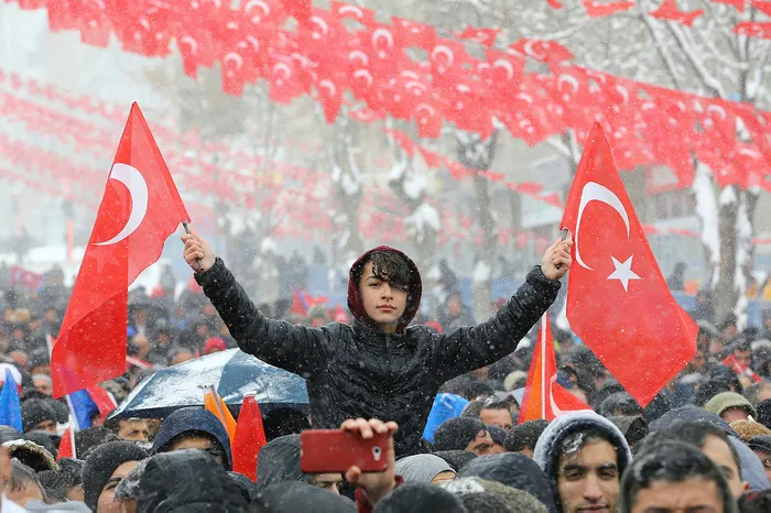 Güzergah boyunca kar yağışı altında bekleyen çok sayıda vatandaş, ellerindeki Türk bayraklarını sallayarak Erdoğan'a sevgi gösterisinde bulundu.