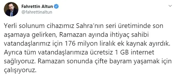 İletişim Başkanı Altun yaptığı paylaşımda, "Yerli solunum cihazımız Sahra'nın seri üretiminde son aşamaya gelirken, Ramazan ayında ihtiyaç sahibi vatandaşlarımız için 176 milyon liralık ek kaynak ayırdık. Ayrıca tüm vatandaşlarımıza ücretsiz 1 GB internet sağlıyoruz. Ramazan sonunda çifte bayram yaşamak için çalışıyoruz." ifadelerine yer verdi.