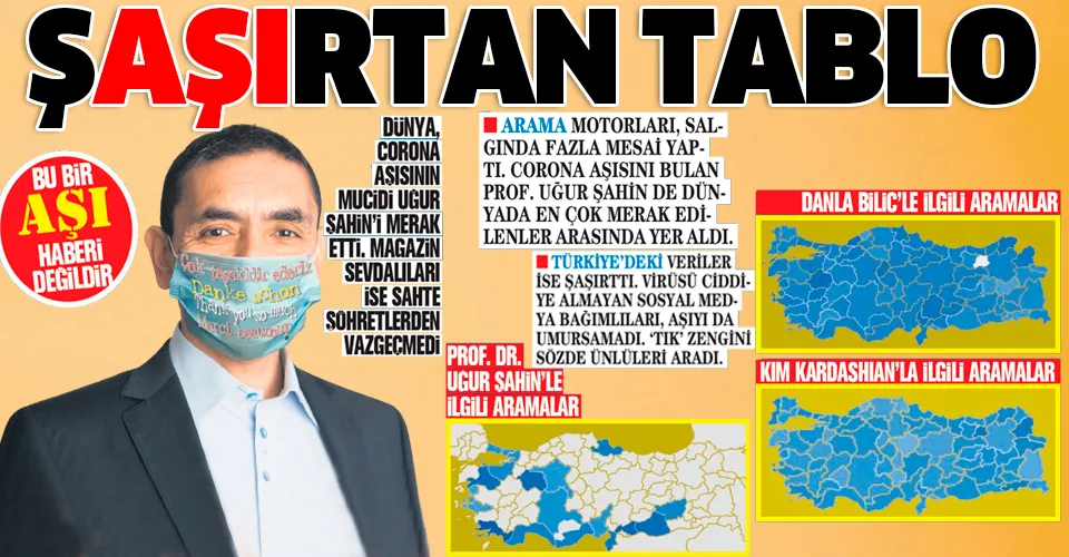Dünya, corona aşısının mucidi Uğur Şahin'i merak etti. Magazin sevdalıları ise sahte şöhretlerden vazgeçmedi. Arama motorları, salgında fazla mesai yaptı. Corona aşısını bulan Prof. Uğur Şahin de dünyada en çok merak edilenler arasında yer aldı.
