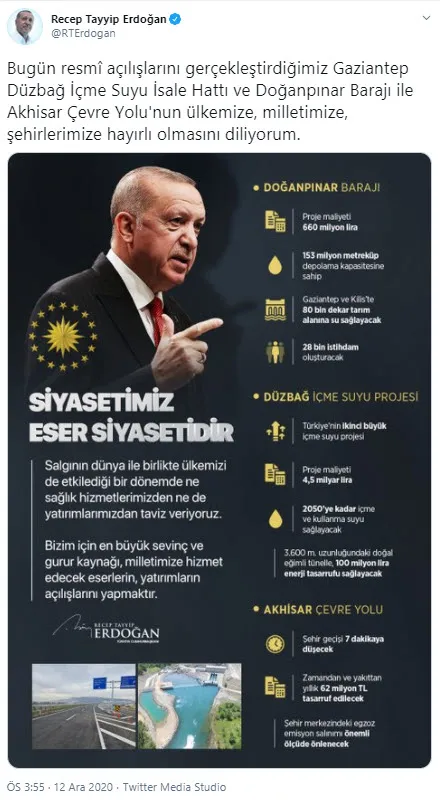 Başkan Recep Tayyip Erdoğan, Gaziantep Düzbağ İçme Suyu İsale Hattı ve Doğanpınar Barajı açılış törenine canlı bağlantı ile katıldı. Daha sonra da Manisa- Akhisar Çevre Yolu açılışında konuşan Başkan Erdoğan, önemli mesajlar verdi.