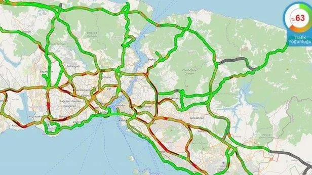 İBB'nin trafik durumu haritasına göre İstanbul'da trafik yoğunluğu saat 08.30 itibariyle yüzde 65'i buldu.